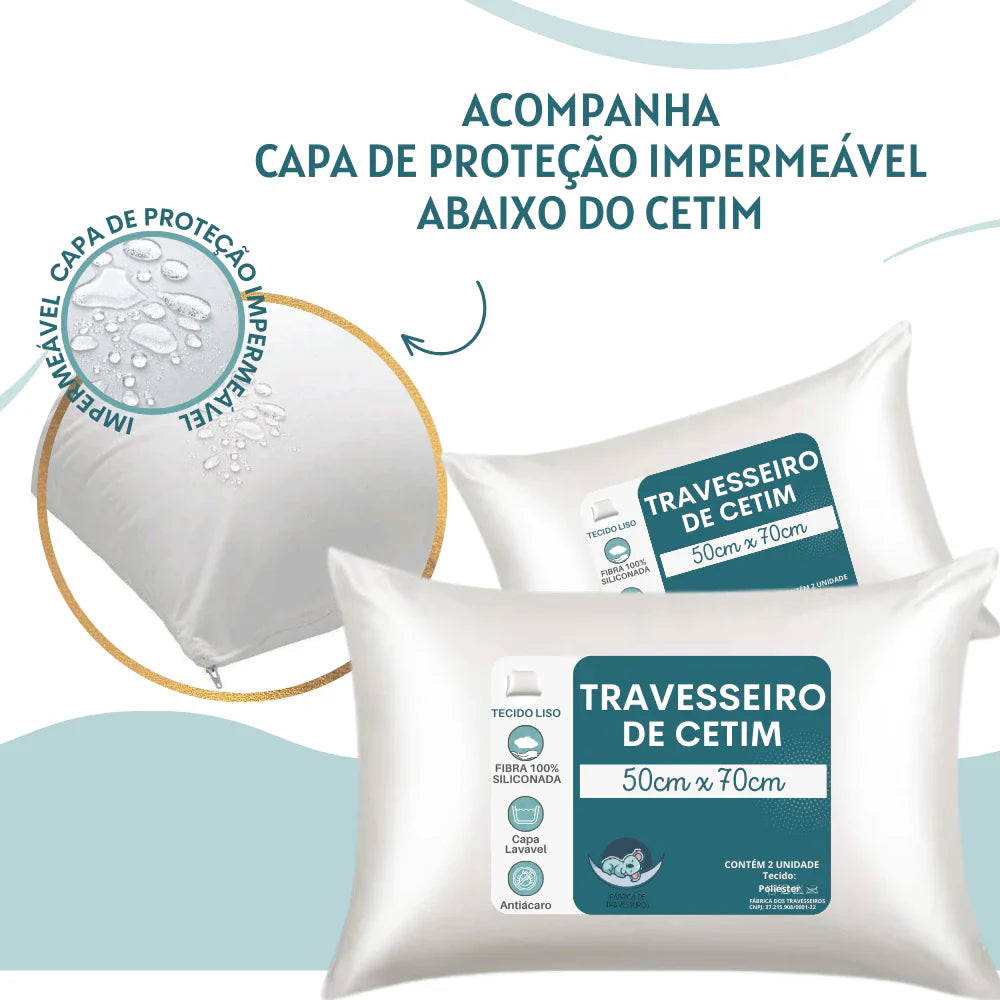 KIT LUXO 02 TRAVESSEIROS COM FRONHAS DE CETIM DE SEDA E FIBRA SILICONADA