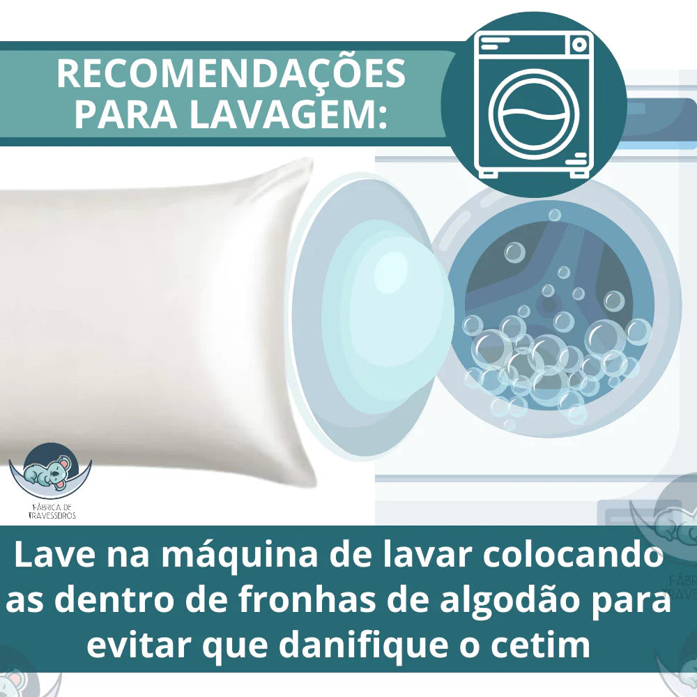 Lave à mão com detergente neutro. Evite máquina de lavar para preservar a qualidade. Seque em local fresco. Garanta conforto e aconchego para o seu descanso com o Kit de Travesseiros de Cetim de Seda em Fibra de Silicone.